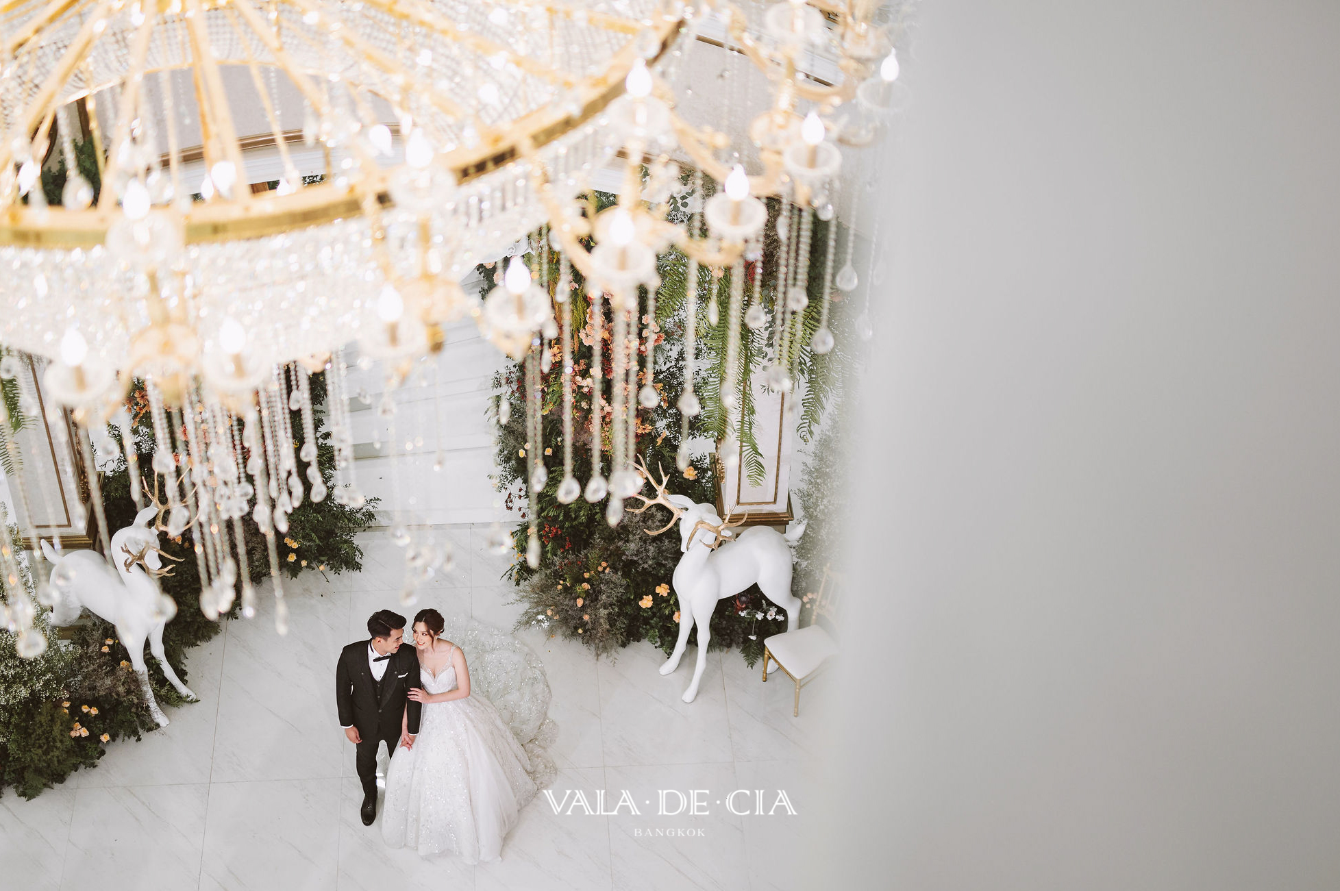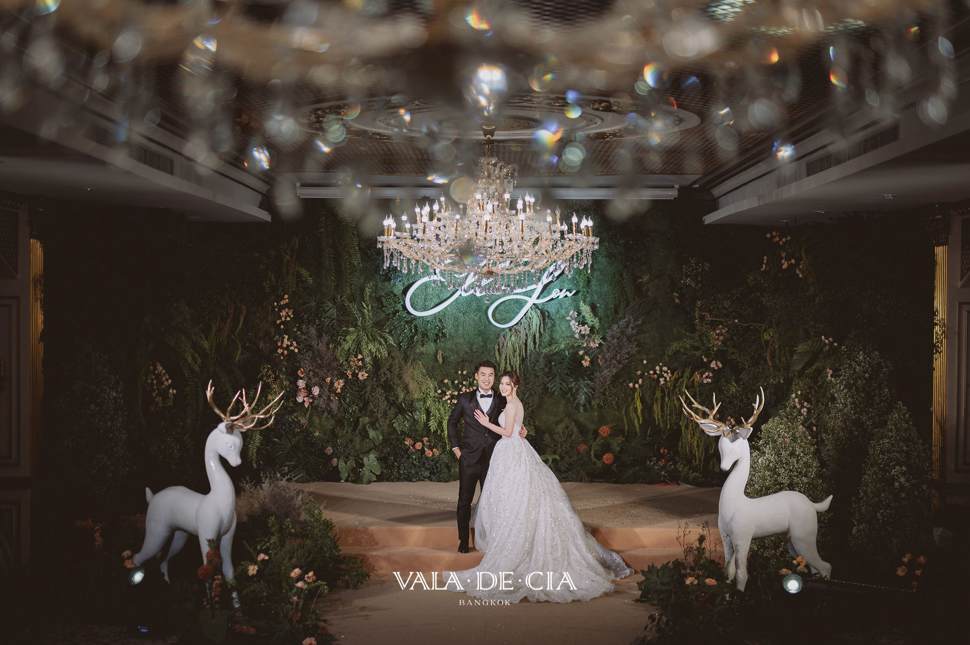 คอนเซ็ปต์ของบ่าวสาวคู่นี้คืองานแต่งงานสุดโรแมนติกและอบอุ่น ด้วยความสดชื่นของแมกไม้สีเขียว แฝงด้วยกลิ่นอายความแฟนตาซีเล็กน้อย เหมือนเป็นป่าในเทพนิยาย ผสมผสานกับความหรูหราคลาสสิคของสถานที่จัดงานแต่งงาน Vala De Cia ที่ทั้งคู่ประทับใจ